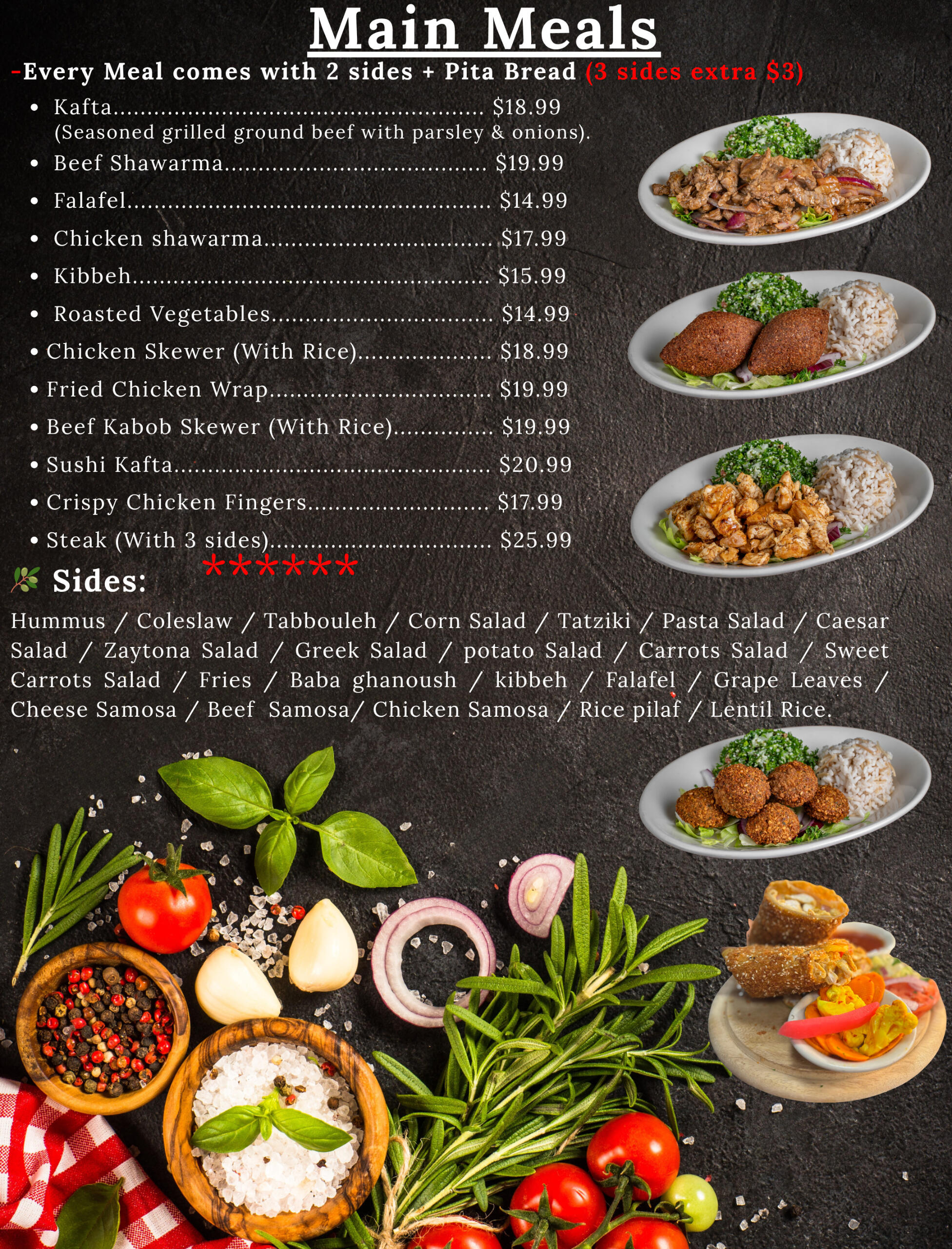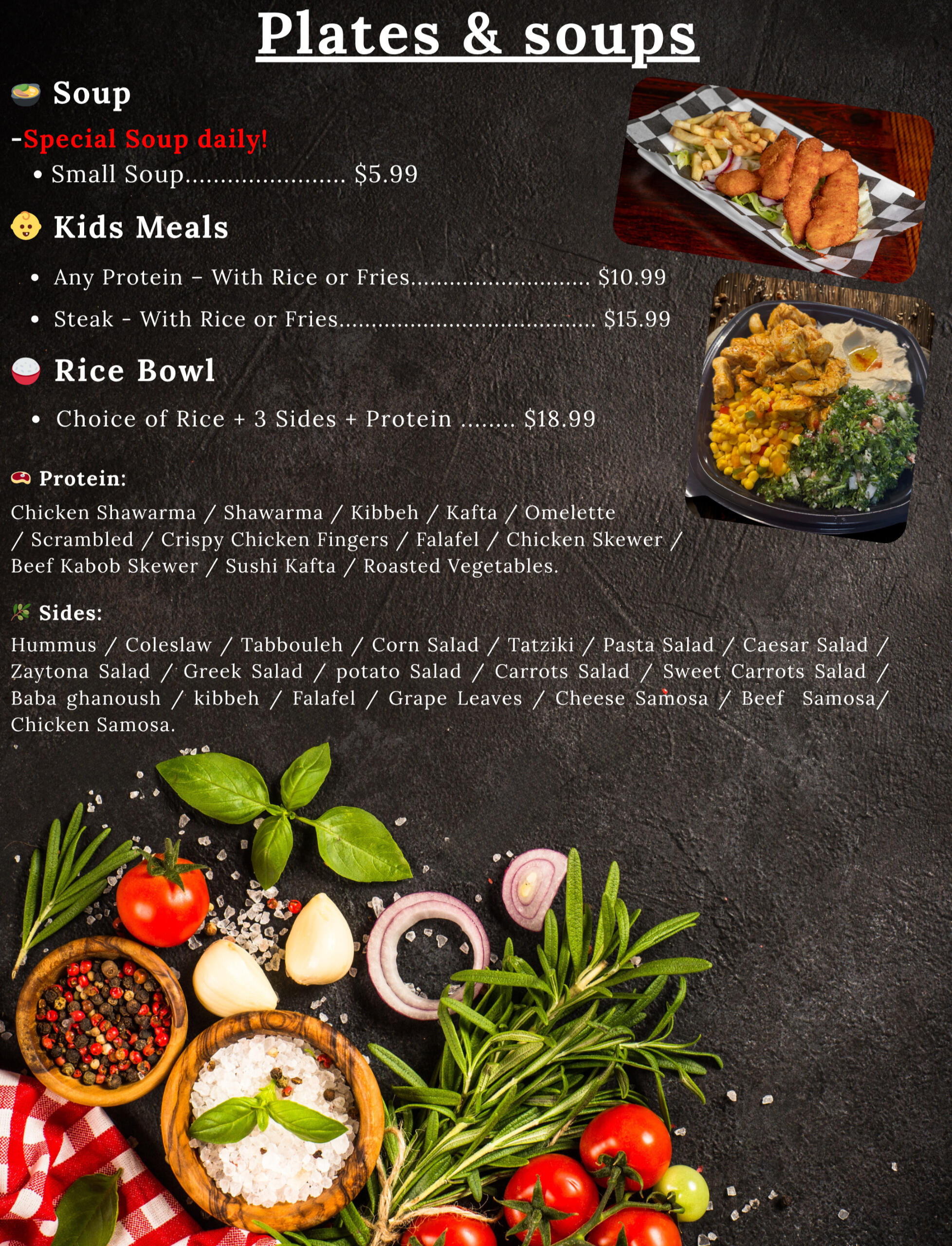 Discover Our Menu! Fresh, bold, and made daily—From sizzling platters to creamy hummus, juicy wraps, salads, and comforting soups—every bite hits different.